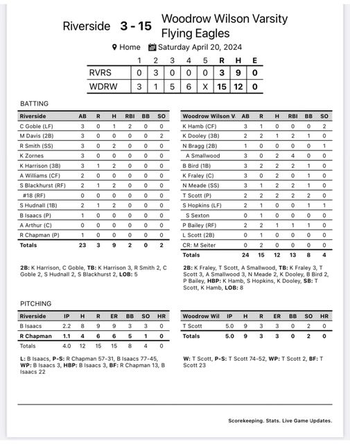 Aubrey Smallwood had a double, a single and four RBI to lead the Flying Eagles. Brooke Bird, Natalia Meade and Taylor Scott had two hits and two RBI each. Scott and Kacie Fraley had doubles.