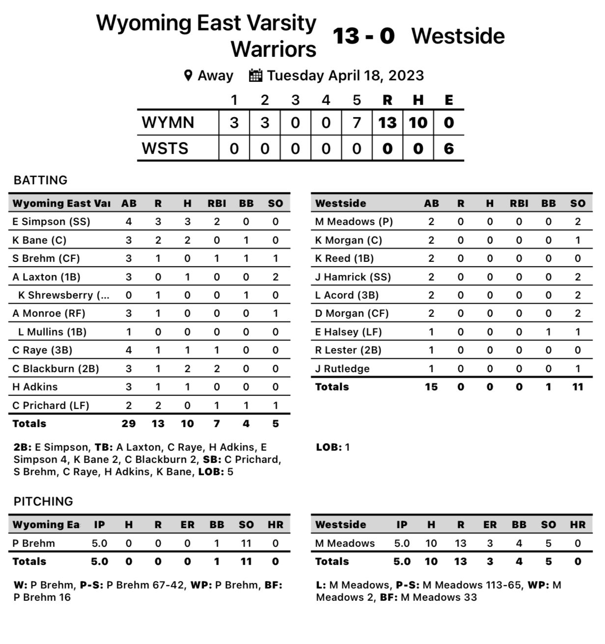 Clear Fork – Wyoming East freshman Paytin Brehm tossed a no-hitter Tuesday as the Lady Warriors beat county foe Westside 13-0 in Clear Fork.