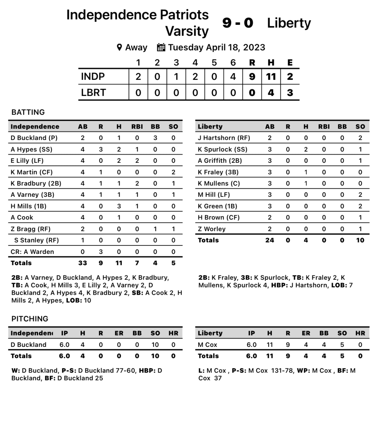 Independence collected 12 hits with half of them coming as two-baggers. Ali Hypes smacked a pair of doubles, while Buckland, Lilly, Avorie Varney and Kassidy Bradbury had one each.