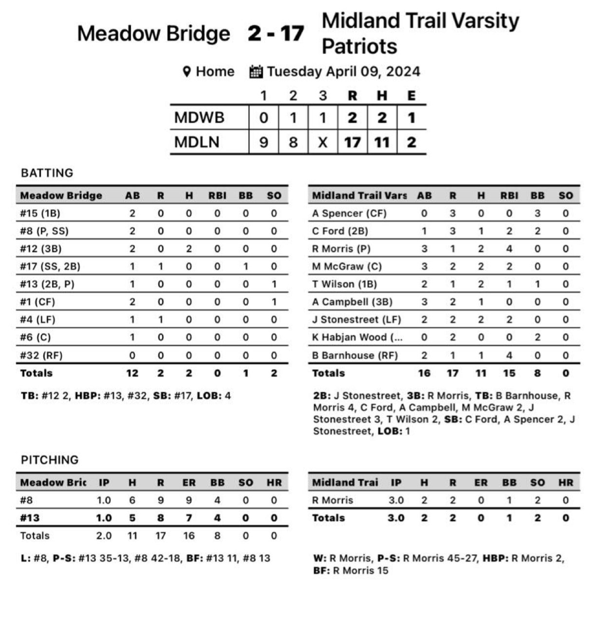 Hico – Midland Trail capped a doubleheader sweep with victories of 22-0 and 17-2 over county foe Meadow Bridge Tuesday.