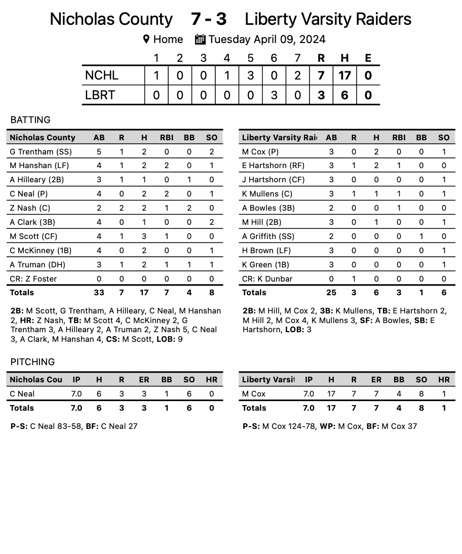 Glen Daniel – Nicholas County turned 17 hits into seven runs, claiming a 7-3 win over Liberty.