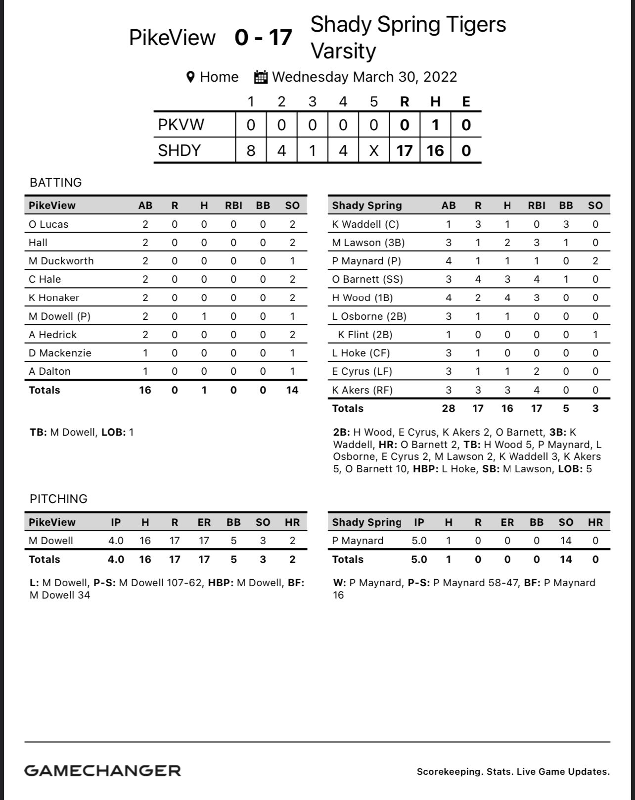 Shady Spring – Shady Spring’s Olivia Barnett hit three total home runs and pitched perfect inning as Shady Spring swept a doubleheader against PikeView, winning both games 17-0.