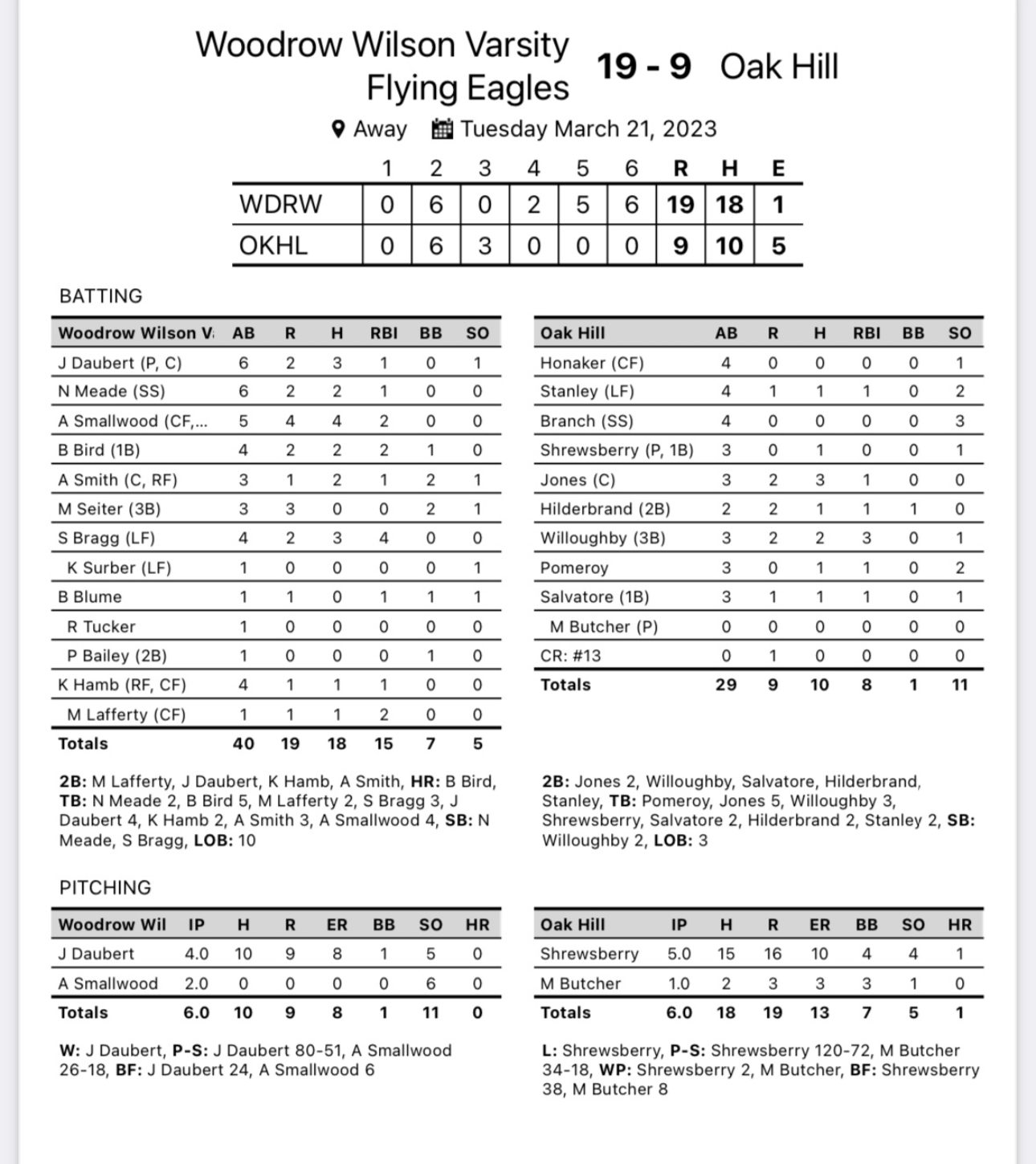 Aubrey Smallwood led the charge with four hits and two RBI for the Flying Eagles while striking out six over the final two innings to secure the victory while Brooklyn Bird swatted a dinger.