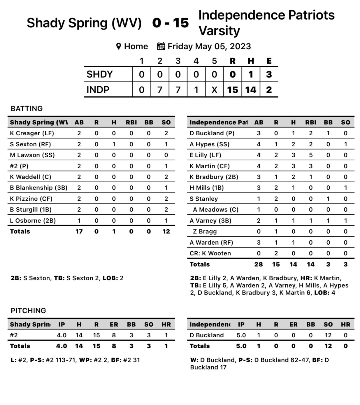 Coal City – Independence pounded out 14 hits Friday, rolling to a 15-0 win over Shady Spring Friday in Coal City.