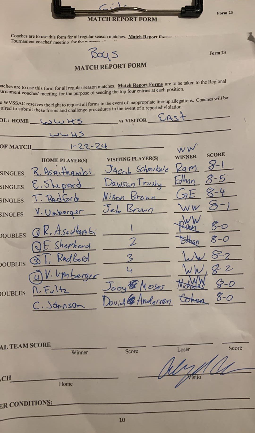Asaithambi and Shepard won No. 1 doubles, while Tyler Radford and Umberger captured No. 2 doubles. Nicholas Fultz and Camden Johnson made it a sweep for the Flying Eagles by winning No. 3 doubles.