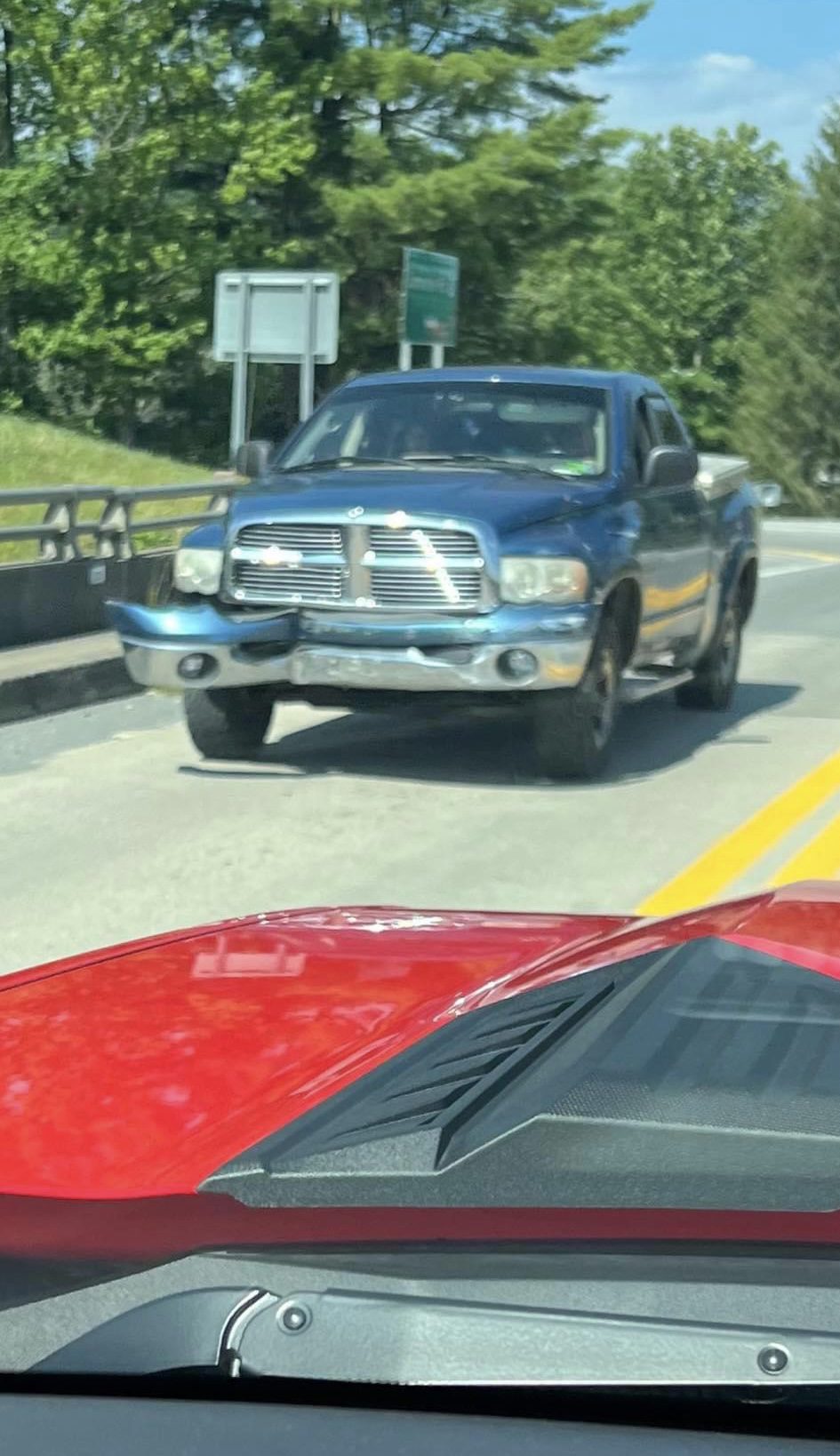 The vehicle has been identified as a blue Dodge Ram pickup truck.