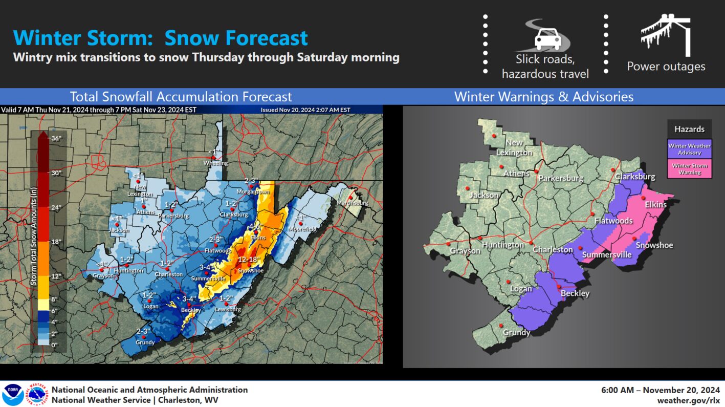 CHARLESTON, WV (LOOTPRESS) – The National Weather Service (NWS) in Charleston has issued a forecast calling for rain to transition to snow in parts of the region by Thursday, with significant snow accumulation expected in higher elevations.
