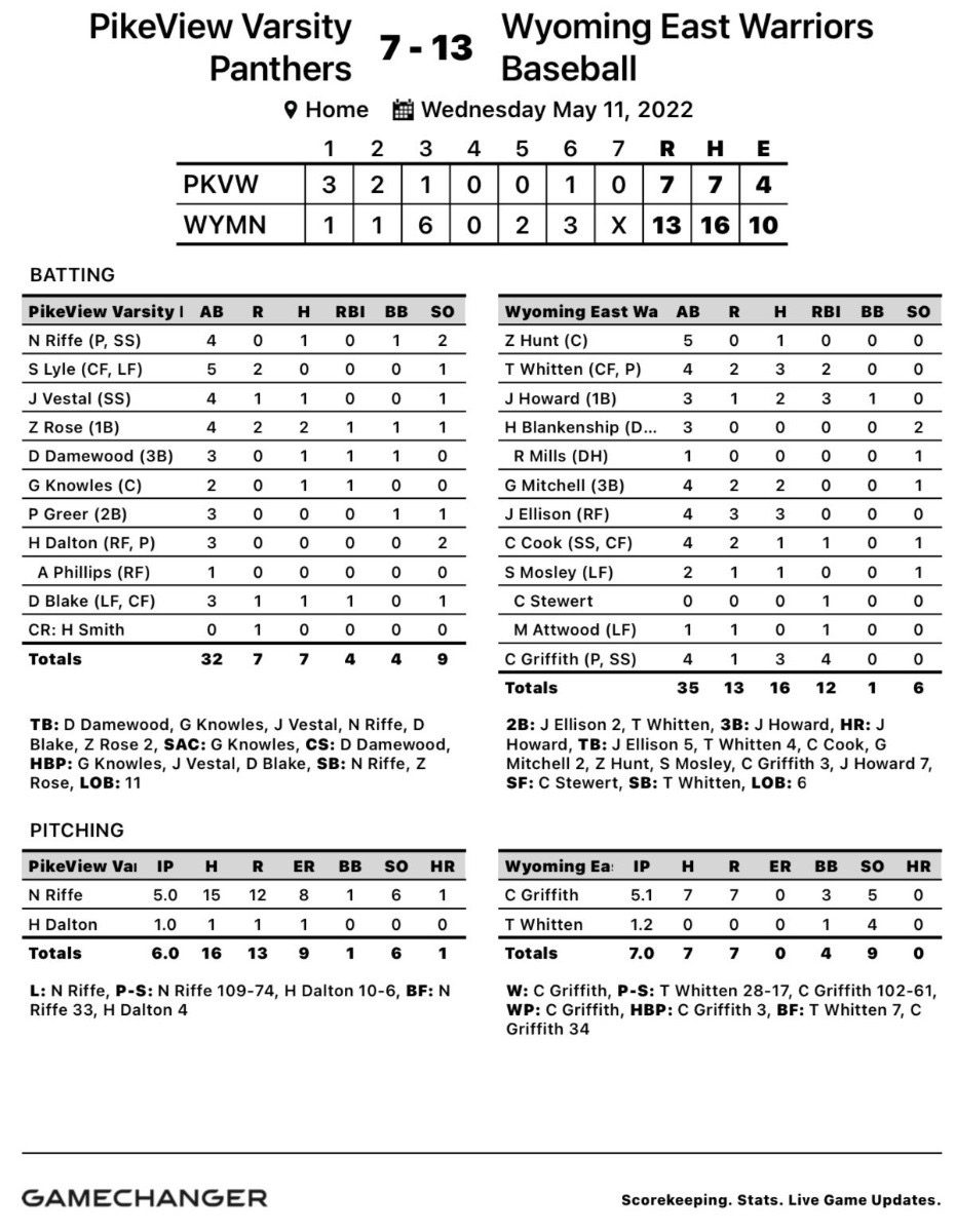 New Richmond – Wyoming East pounded out 16 hits to offset 10 errors and went on to defeat PikeView 13-7 Wednesday in their Class AA Region 3, Section 1 elimination game.