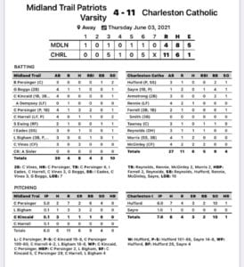 Charleston – Resuming a game that was started Thursday, Midland Trail allowed five runs in the sixth inning, losing 11-4 to Charleston Catholic on Friday.