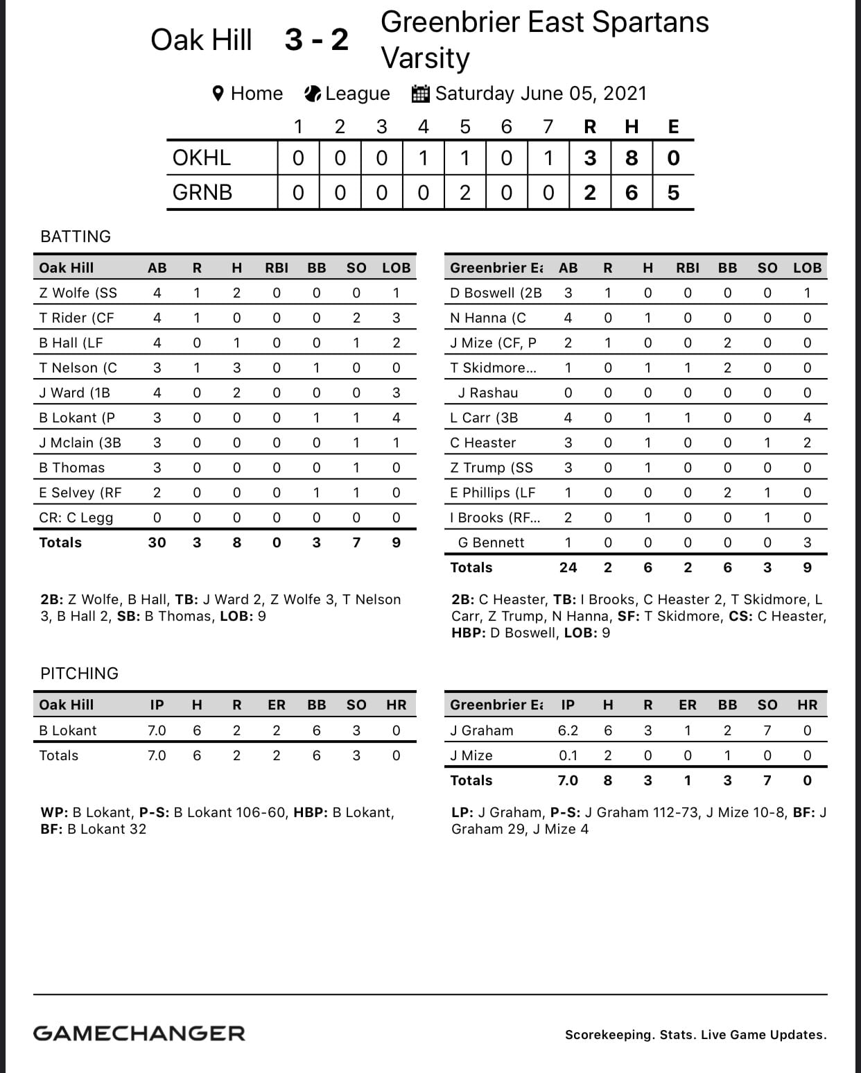 Brad Lokant picked up the win for Oak Hill, pitching a complete game. Ty Nelson led Oak Hill at the plate with three hits.