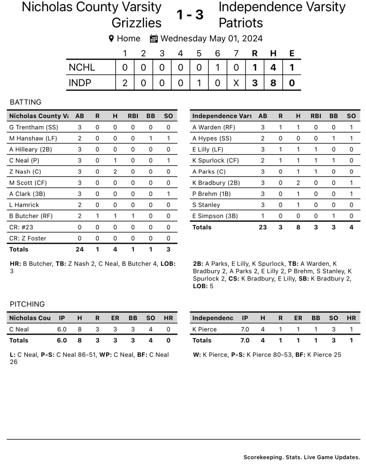 The Patriots scored two runs in the bottom of the first inning and made it stand in a 3-1 win over Nicholas County in a Class AA Region 3, Section 2 elimination game in Coal City.