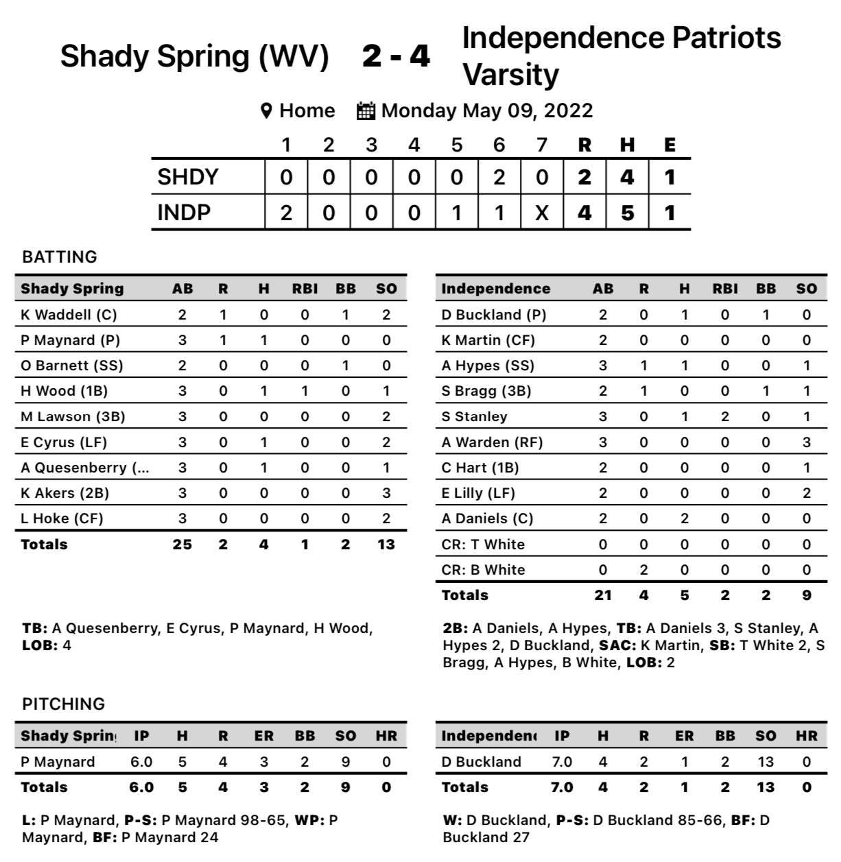 Buckland finished the game with 13 strikeouts, while Maynard added nine.