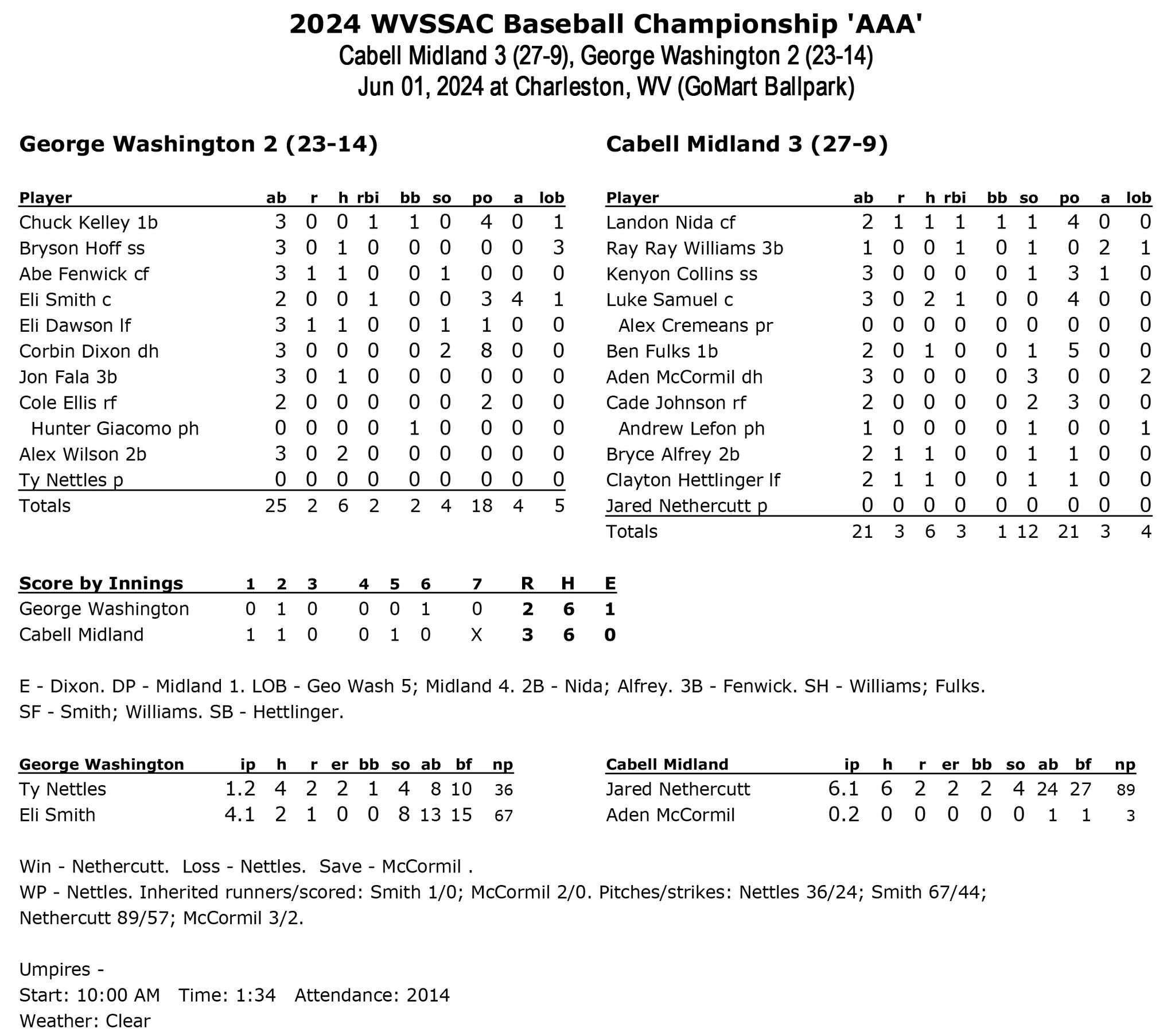 Charleston – Defending Class AAA state baseball champion Cabell Midland won its second straight championship with a dramatic 3-2 win over George Washington at Go-Mart Park Saturday.