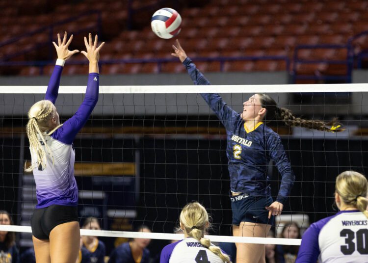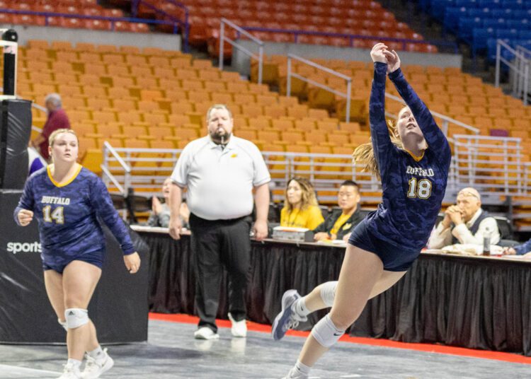 Mya Dunlap dropped a winner from the middle which was followed by a kill from Maggie Boroski. An attacking error by the Bison and an ace from Ava Pitzer pushed the lead to seven in a 25-19 win.