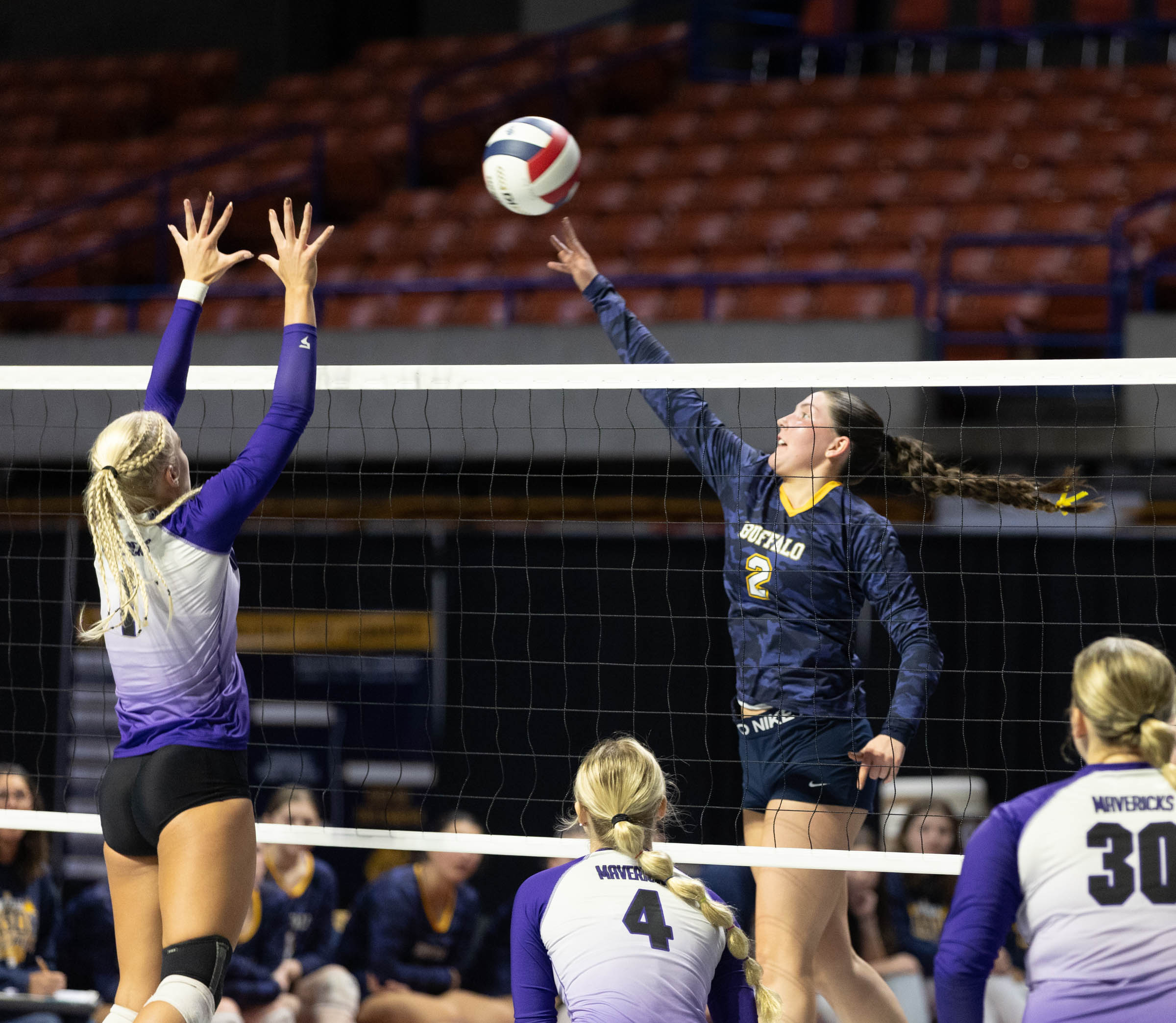 A kill and an ace from Pitzer gave the Mavs a set point opportunity, but they could not close out the critical set.