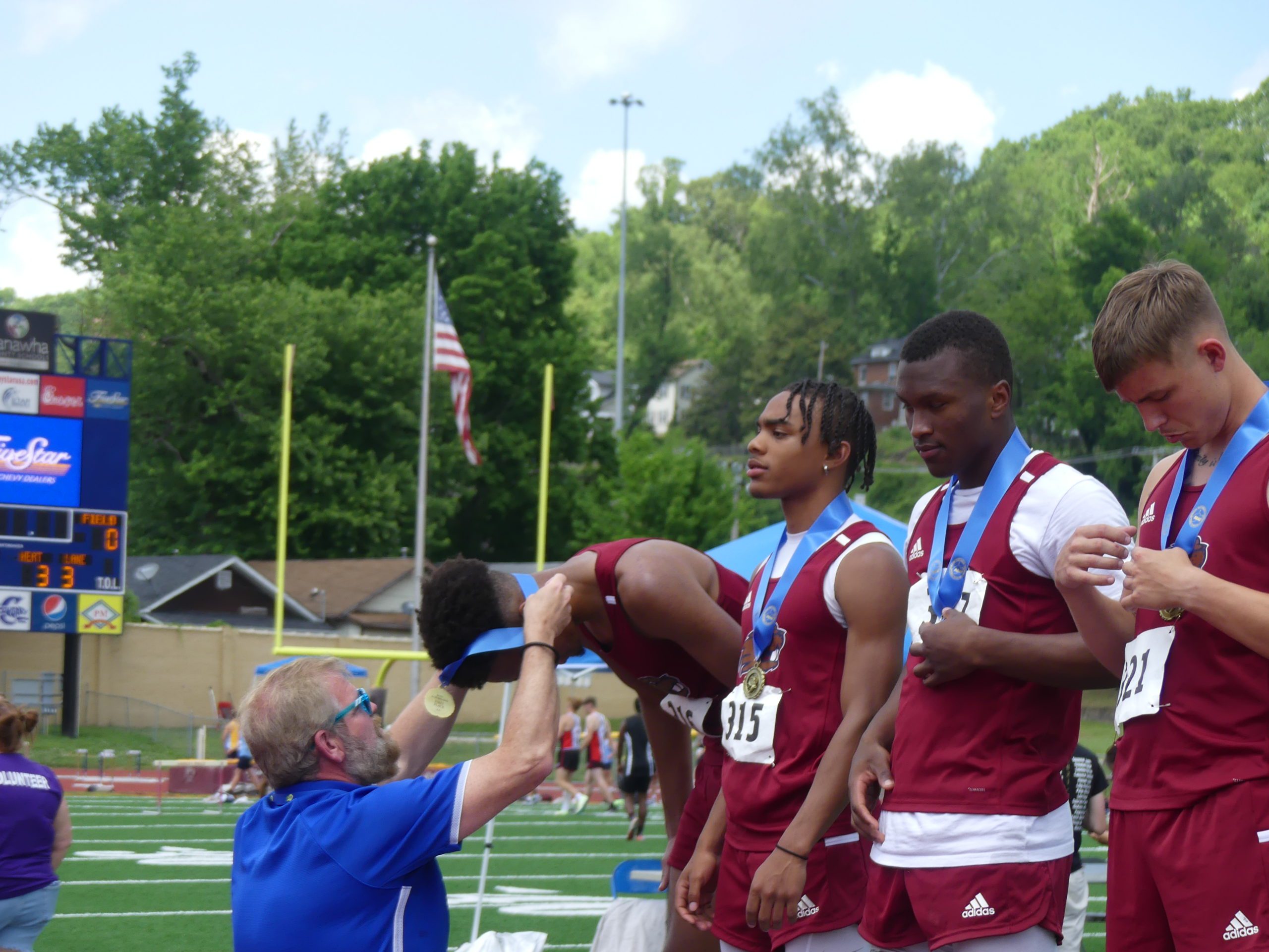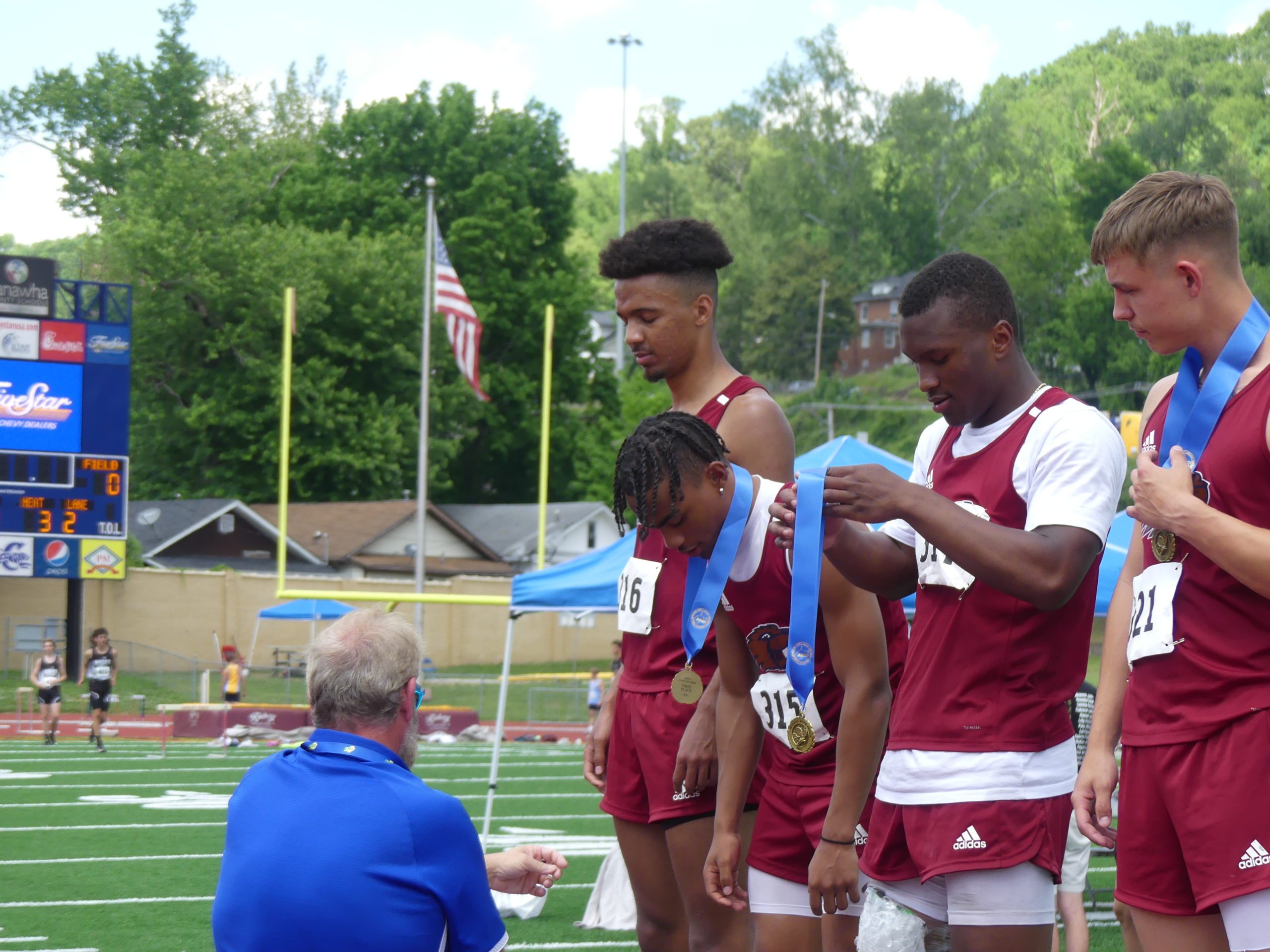 The quadruplet of Sencere Fields, Amir Hairston, Gage Sisk and Jacorian Green rallied together to claim the Class AA 4×100-meter relay at the State Track Meet Thursday at Laidley Field in Charleston.