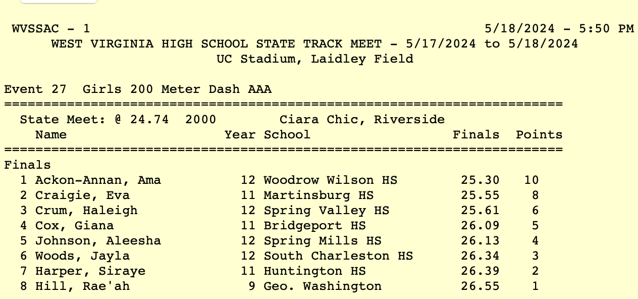 Ackon-Annan finished the race in 25.30 seconds, ahead of Eva Craigie (25.55) from Martinsburg and Haleigh Crum (25.61) from Spring Valley.