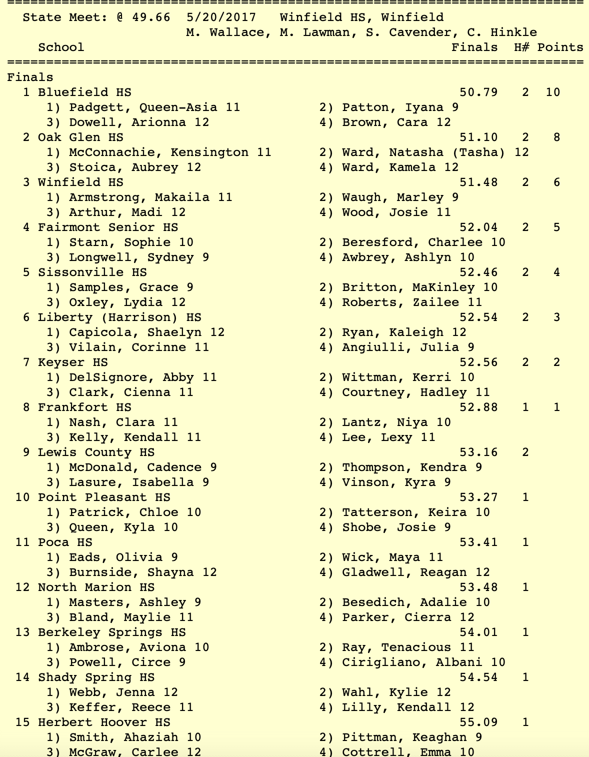 Entering the state meet, the Beavers had posted the sixth best time in the state in the 4×100 relay and were not really expected to contend for the title. Bluefield had the third best time in the 4×200 relay.