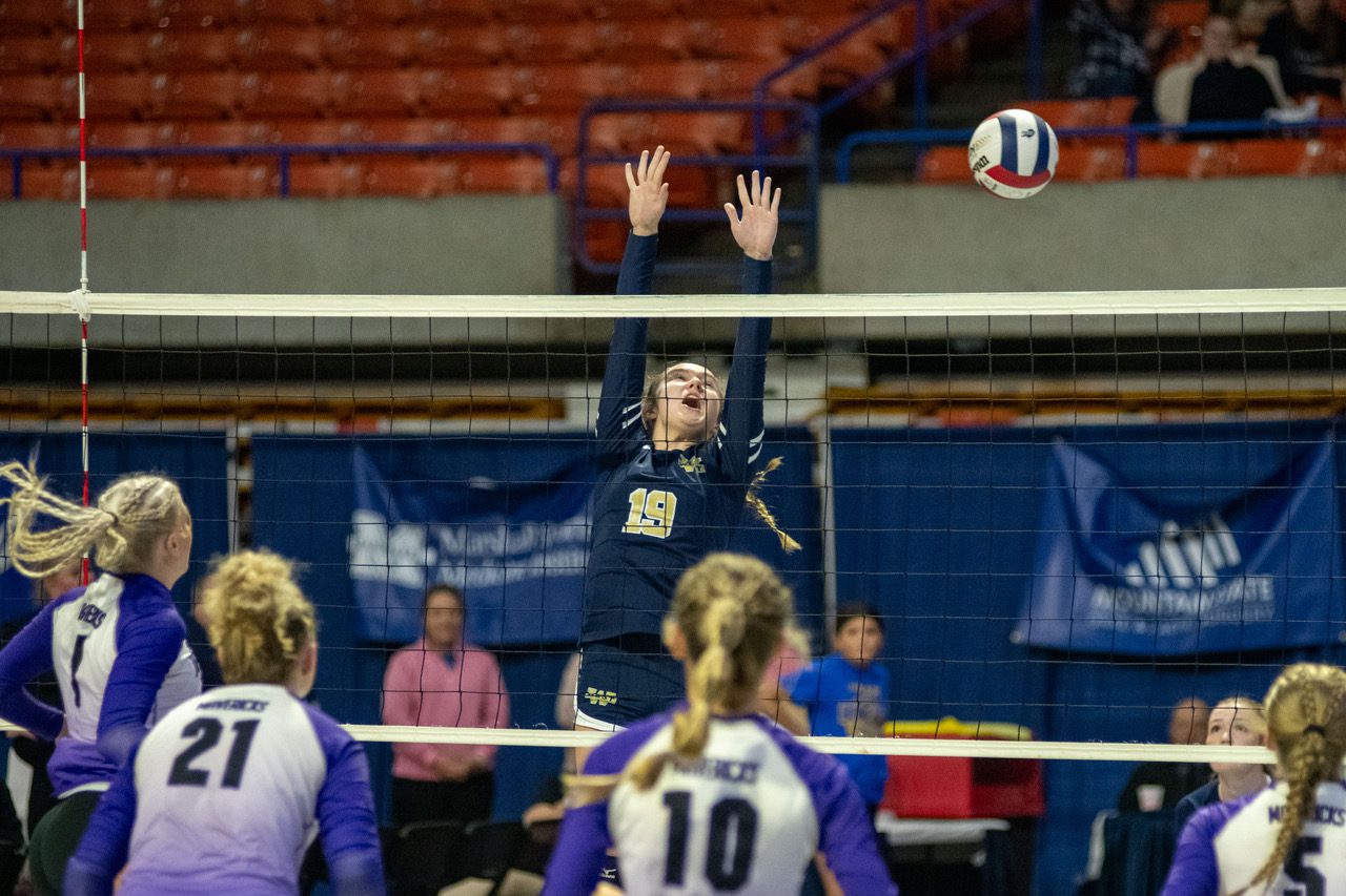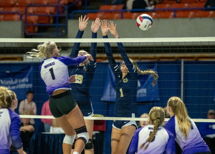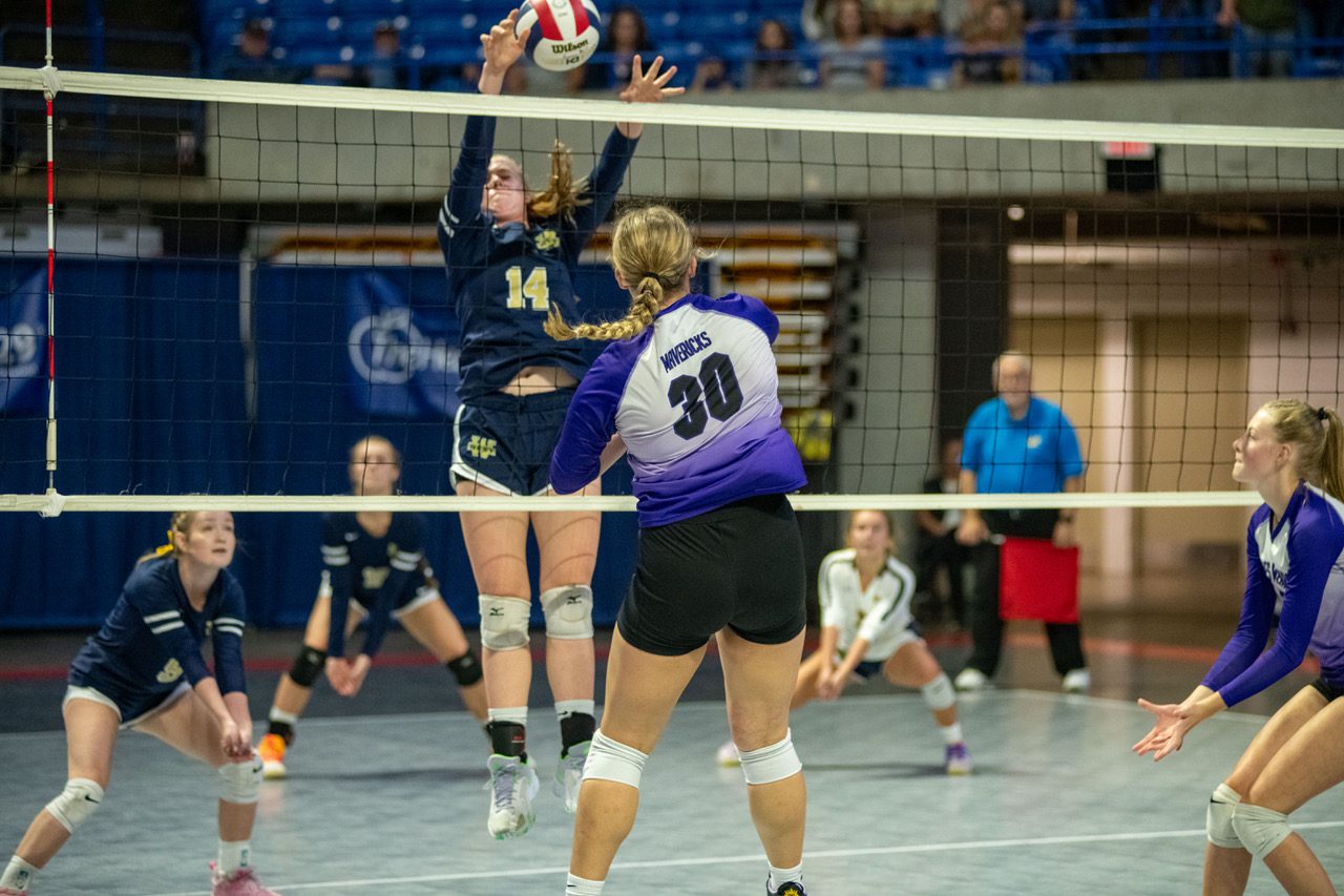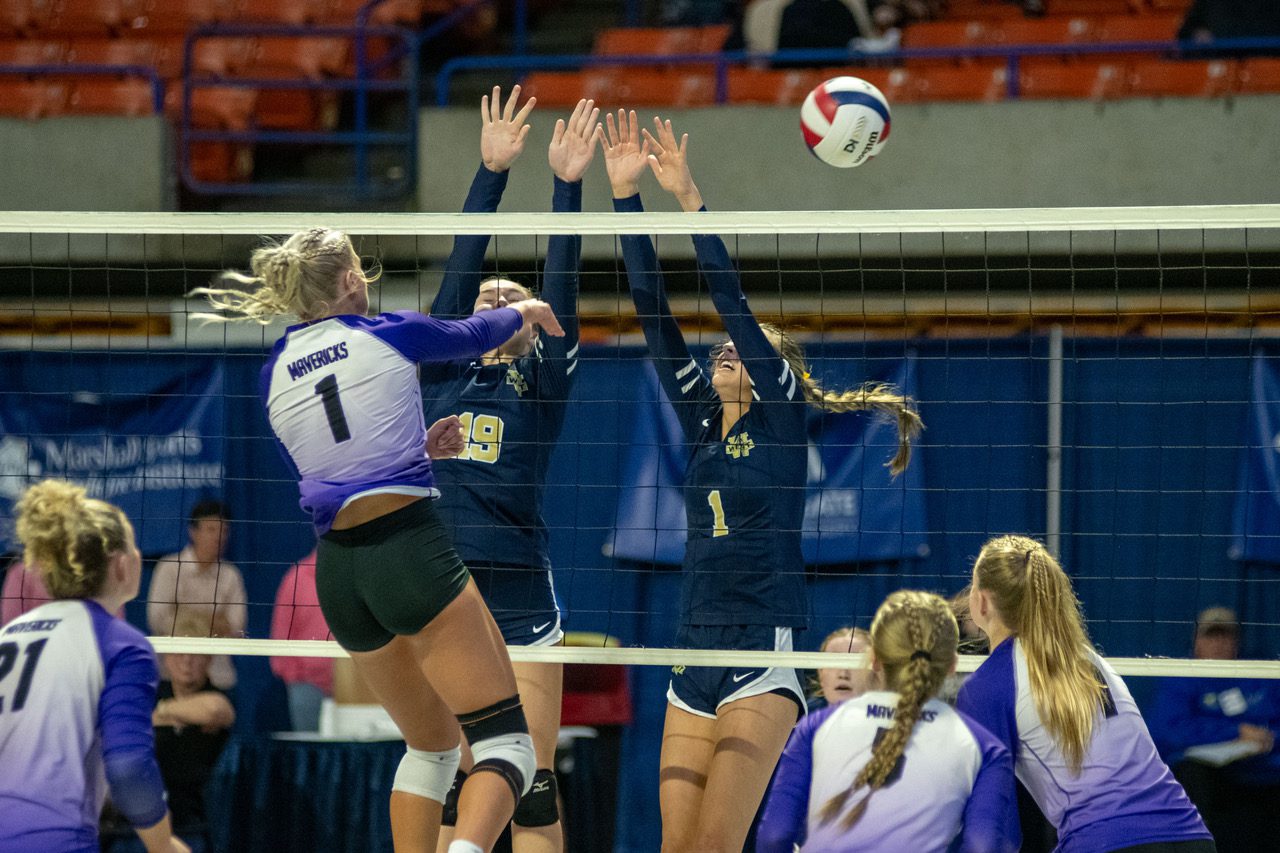 After splitting the first two sets, James Monroe jumped out to a 12-7 led in set three. West responded with a 12-2 run, but could not pull away from the Mavericks.