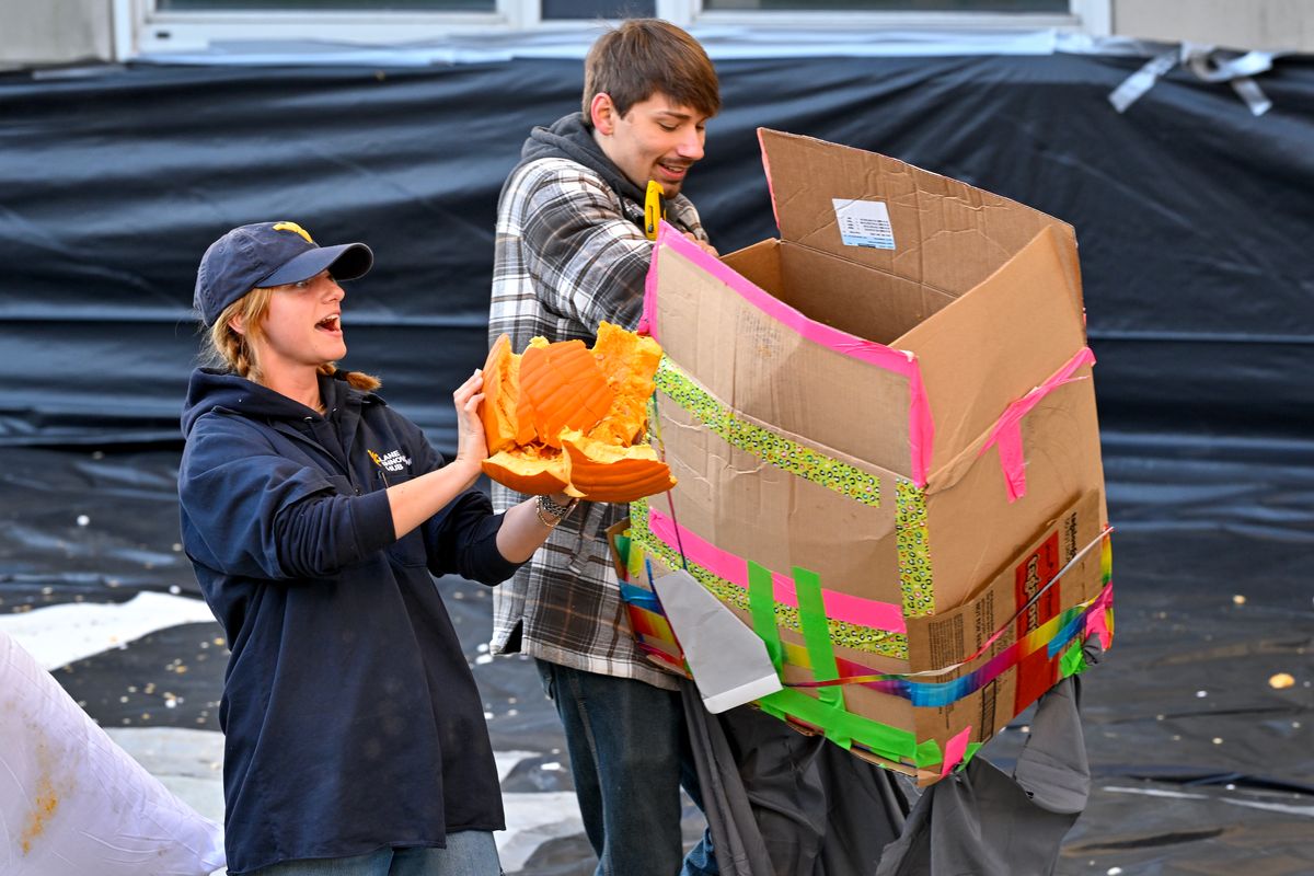 Junior theatre design major Daney Brookover designed the Pumpkin Drop target, painted by art education major Peyton Raffel. Brookover also created the set for WVU’s “Into the Woods” production, running through Monday at the Metropolitan Theater.