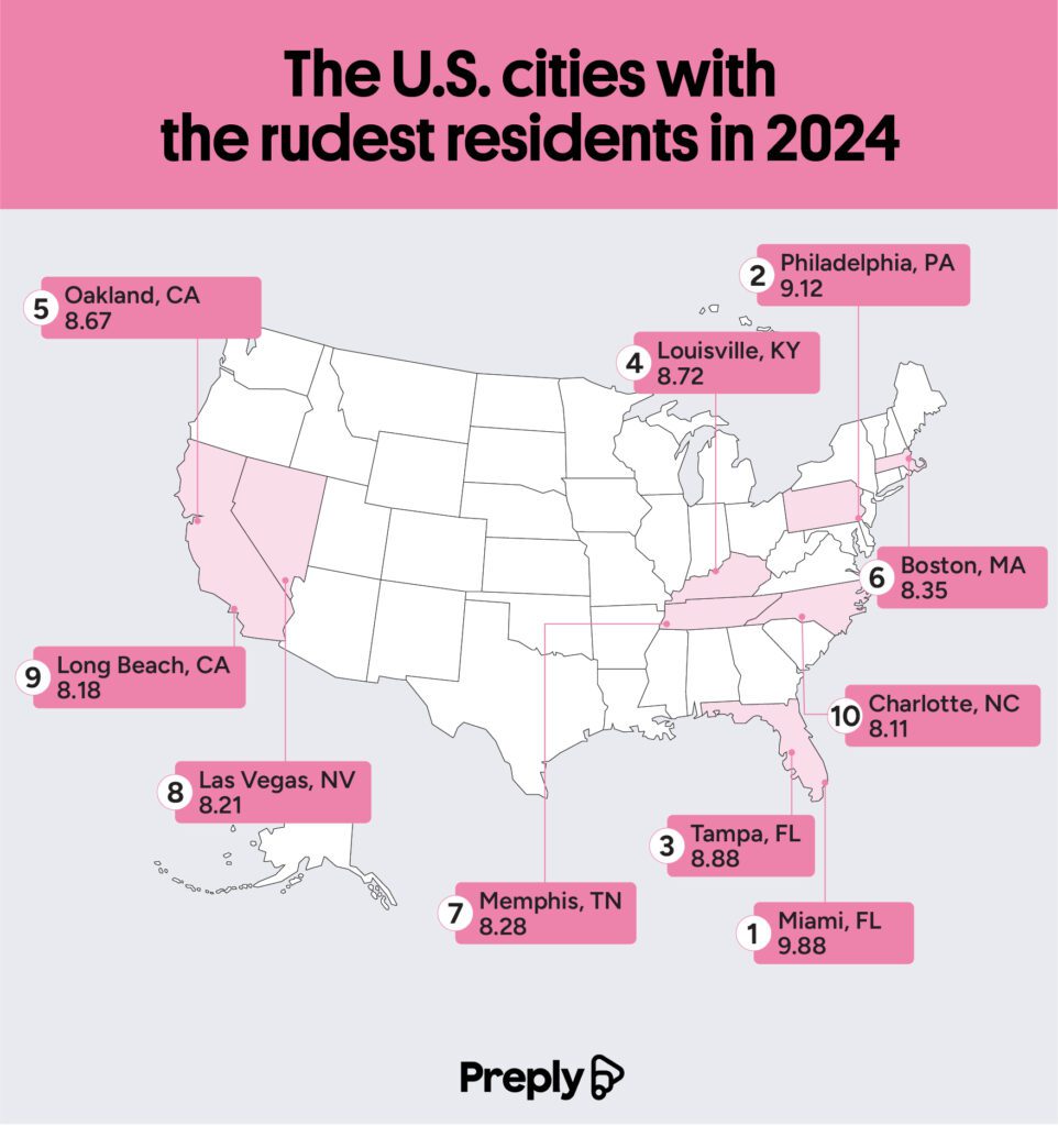 • Residents in Miami, FL, Philadelphia, PA, and Tampa, FL, are the rudest in 2024.