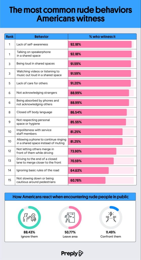 • Lack of care for others, being loud in shared spaces, and a lack of self-awareness are the most common rude behaviors Americans witness others doing in public.