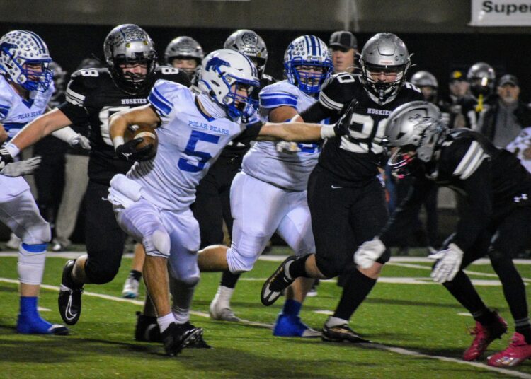 The Huskies, who never led in the first half, remedied that in the third when Aaron Hoffman scored from 10 yards out, one his four rushing scores on the evening. Ours answered with touchdown No. 3 to knot it but the Huskies seized the momentum again when a punt on their following possession was muffed by the Polar Bears and recovered by the Huskies, setting up a Minor touchdown run from 17 yards out. Two more scores from Ours and one from Hoffman led to a 42-42 tie before the Huskies handed the Polar Bears the equalizer.