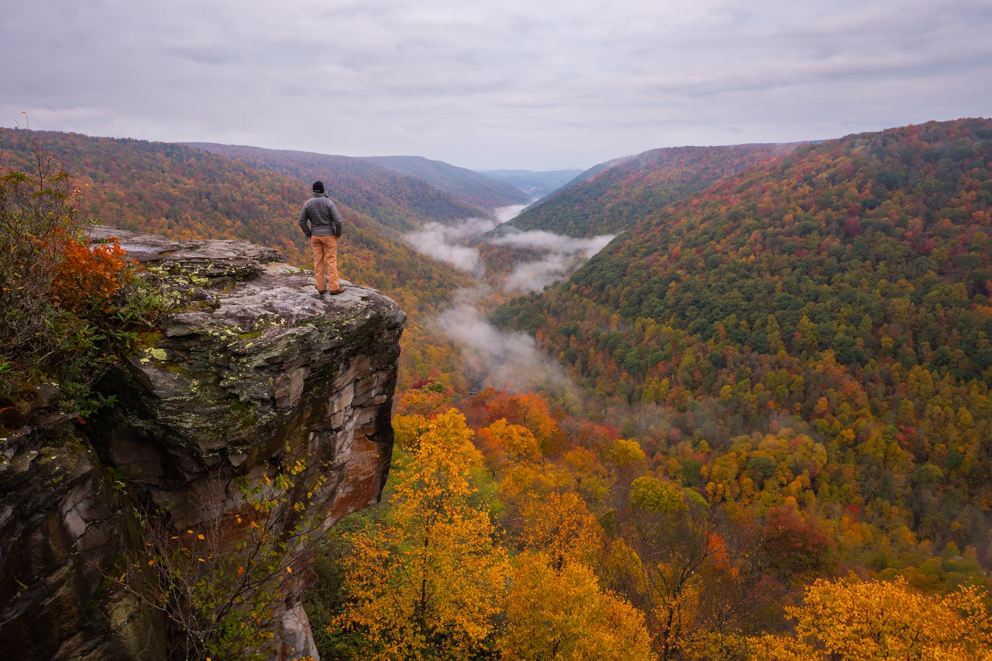 Another prime spot is Blackwater Falls State Park, where the iconic Blackwater Falls is set against a backdrop of autumn foliage. Visitors can climb the historic Olson Fire Tower for a 360-degree view.