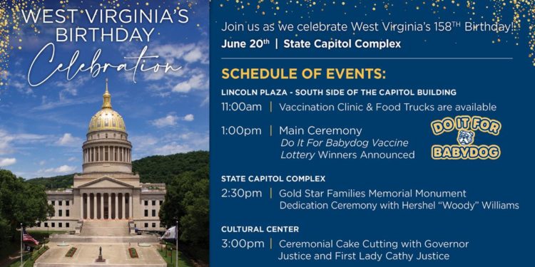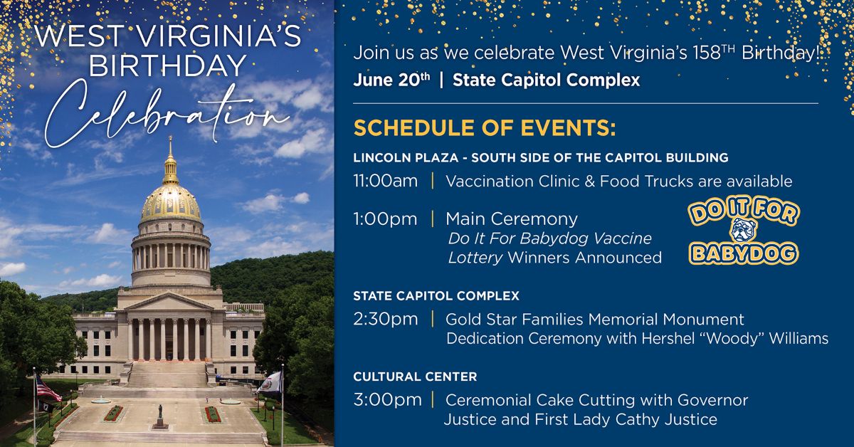 CHARLESTON, WV – Gov. Jim Justice is inviting all West Virginians to the State Capitol Complex in Charleston this Sunday, June 20, 2021, for a day of fun in celebration of West Virginia’s 158th birthday and to watch the first prize giveaway of the “Do it for Babydog: Save a life, Change your life” vaccination sweepstakes.