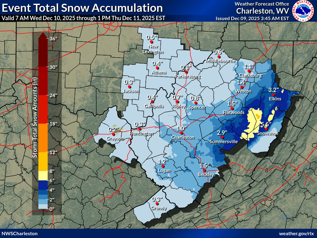 Forecasters predict snowfall totals of 4 to 7 inches across most areas, with locally higher amounts possible. Eastern Tucker County could receive up to 6 inches, while ridgetop locations in Western Pendleton and Western Grant counties may see as much as 10 inches.