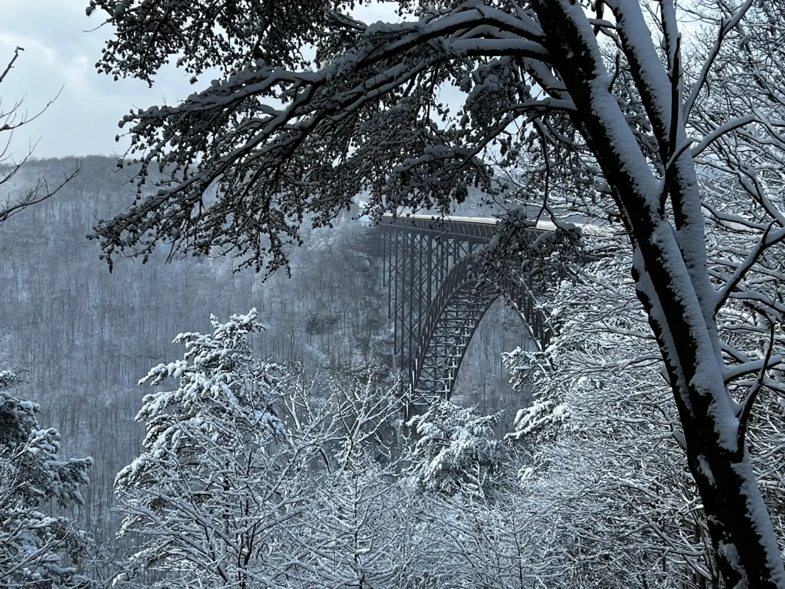 Winter visitors are encouraged to begin their journey at the Canyon Rim Visitor Center, where a short boardwalk leads to sweeping overlooks of the iconic New River Gorge Bridge — often framed by snow-covered evergreens. When conditions allow, the Fayette Station Road scenic byway offers an intimate look at the Gorge, winding from the canyon rim to the river’s edge with several pull-offs for photos and short walks.